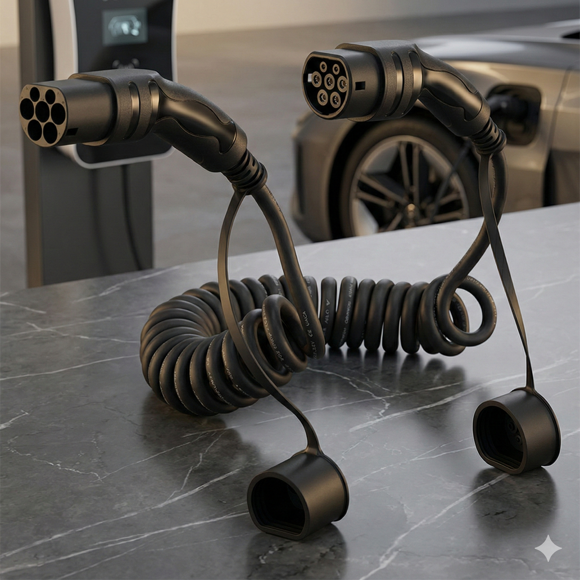 Ladekablet er IP65-klassificeret, hvilket betyder, at det er beskyttet mod støv, snavs og vand. De medfølgende beskyttelseshætter i blødt gummi sikrer, at stikkene holdes rene, når kablet ikke er i brug.