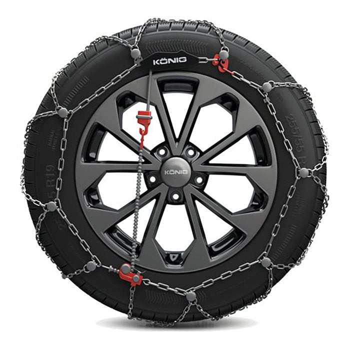 Snekæden er selvspændende, med kun et stop er kæden nem at samle. Mikroreguleringssystemet sikrer perfekt spænding af kæden. Når først snekæden er monteret på hjulet, kræver den ikke noget ekstra stop for efterspænding. König XG-12 har et specielt kædemønster med dobbelt svejsede trækkraftplader.